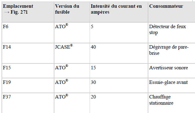 Suivant la version et l'équipement du véhicule, il peut s'ensuivre des différences par rapport aux numéros de fusibles et aux emplacements indiqués dans le tableau. Pour connaître l'affectation exacte des fusibles, adressez- vous à un atelier spécialisé si nécessaire. Nous vous recommandons de vous adresser à votre Partenaire Volkswagen.